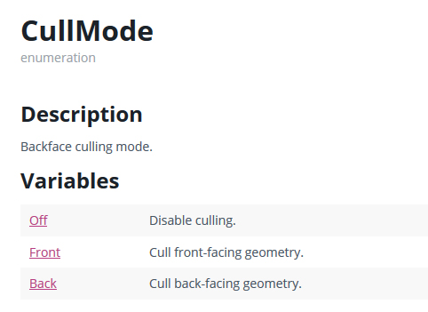 Comp, Pass, Fail and ZFail will be applied to the front-facing geometry, unless Cull Front is specified, in which case it’s back-facing geometry. You can also explicitly specify the two-sided stencil state by defining CompFront, PassFront, FailFront, ZFailFront (for front-facing geometry), and CompBack, PassBack, FailBack, ZFailBack (for back-facing geometry).